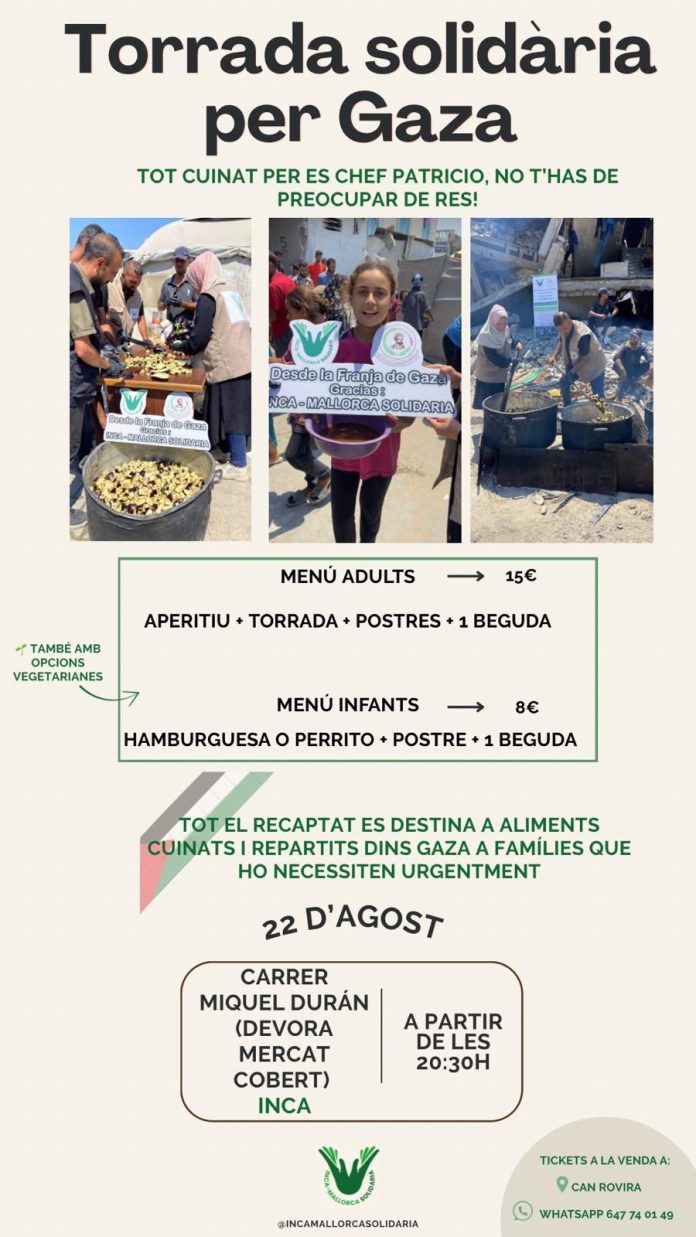 El proper 22 d’agost, el carrer Miquel Durán d’Inca (devora el mercat cobert) es convertirà en l’escenari d’una torrada solidària per Gaza, impulsada per l’ONG Inca Mallorca Solidària. La cita començarà a partir de les 20.30 hores i té com a objectiu recaptar fons destinats a l’elaboració i distribució d’aliments dins la Franja de Gaza, en suport a les famílies que més ho necessiten.