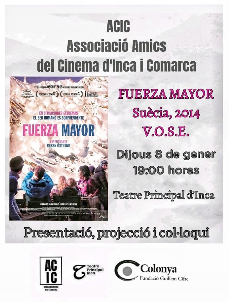 El cineclub Inca i Comarca (ACIC) torna a posar en marxa la seva programació regular aquest dijous 8 de gener amb la projecció de Fuerza mayor, del director suec Ruben Östlund, un dels noms més reconeguts del cinema europeu contemporani.
