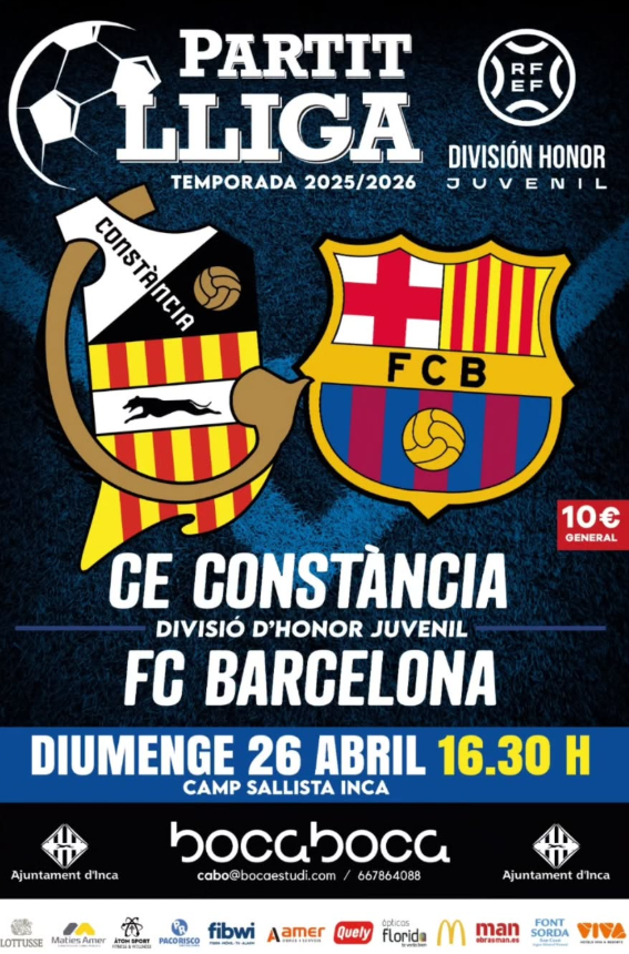 El Juvenil A del CE Constància tancarà aquest cap de setmana a Inca la seva etapa a la Divisió d’Honor amb un partit d’alt voltatge davant el líder de la categoria, el FC Barcelona. El conjunt inquer jugarà demà a casa el darrer partit de lliga, en un duel marcat més per l’orgull i el comiat que no per la classificació.