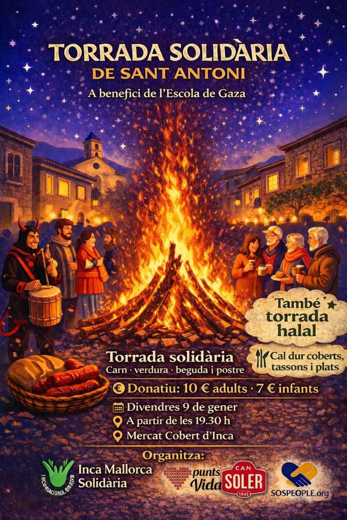 Aquest divendres es durà a terme la Torrada Solidària de Sant Antoni, a benefici de l’Escola de Gaza. L’acte tindrà lloc al Mercat Cobert d’Inca, a partir de les 19.30 h, i inclourà carn, verdura, beguda i postre. El donatiu serà de 10 euros per als adults i 7 euros per als infants. L’organització recorda que cal dur coberts, tassons i plats, i informa que també hi haurà torrada halal.