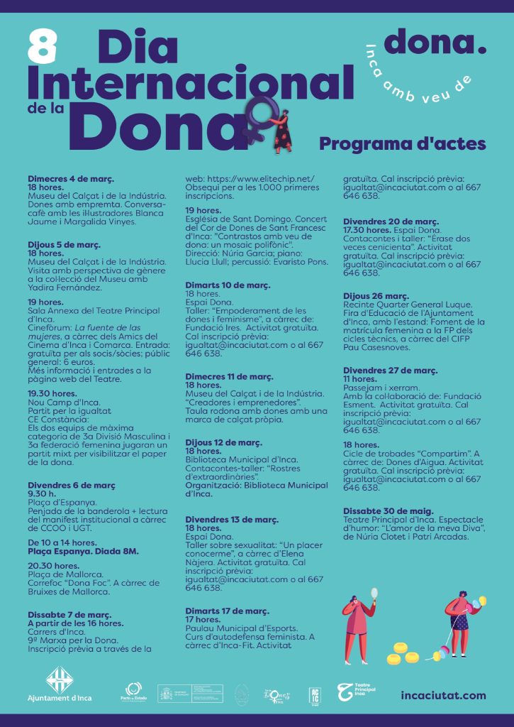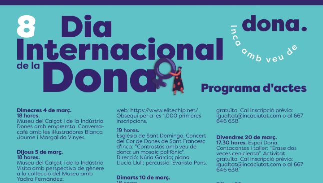 Els actes començaran el dimecres 4 de març al Museu del Calçat i de la Indústria amb una conversa amb dones emprenedores i un cafè amb les il·lustradores Blanca Jaume i Margalida Vinyes. L’endemà hi haurà una visita amb perspectiva de gènere a la col·lecció del museu i, al vespre, un cinefòrum a la Sala Annexa del Teatre Principal d’Inca amb la projecció de La fuente de las mujeres. També s’ha programat un partit per la igualtat al Nou Camp d’Inca i, el divendres 6, la penjada de la bandera i la lectura del manifest institucional a la plaça d’Espanya, a més d’un correfoc al vespre.