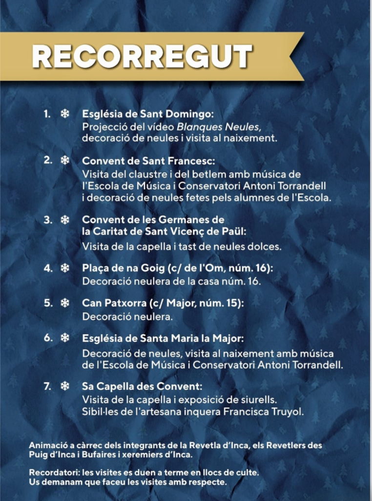 L’itinerari inclou parades a l’església de Sant Domingo, el convent de Sant Francesc, el convent de les Germanes de la Caritat de Sant Vicenç de Paül, la plaça de na Goig, Can Patxorra, l’església de Santa Maria la Major i Sa Capella des Convent, on també es podrà visitar una exposició de siurells Sibil·les de l’artesana inquera Francisca Truyol.