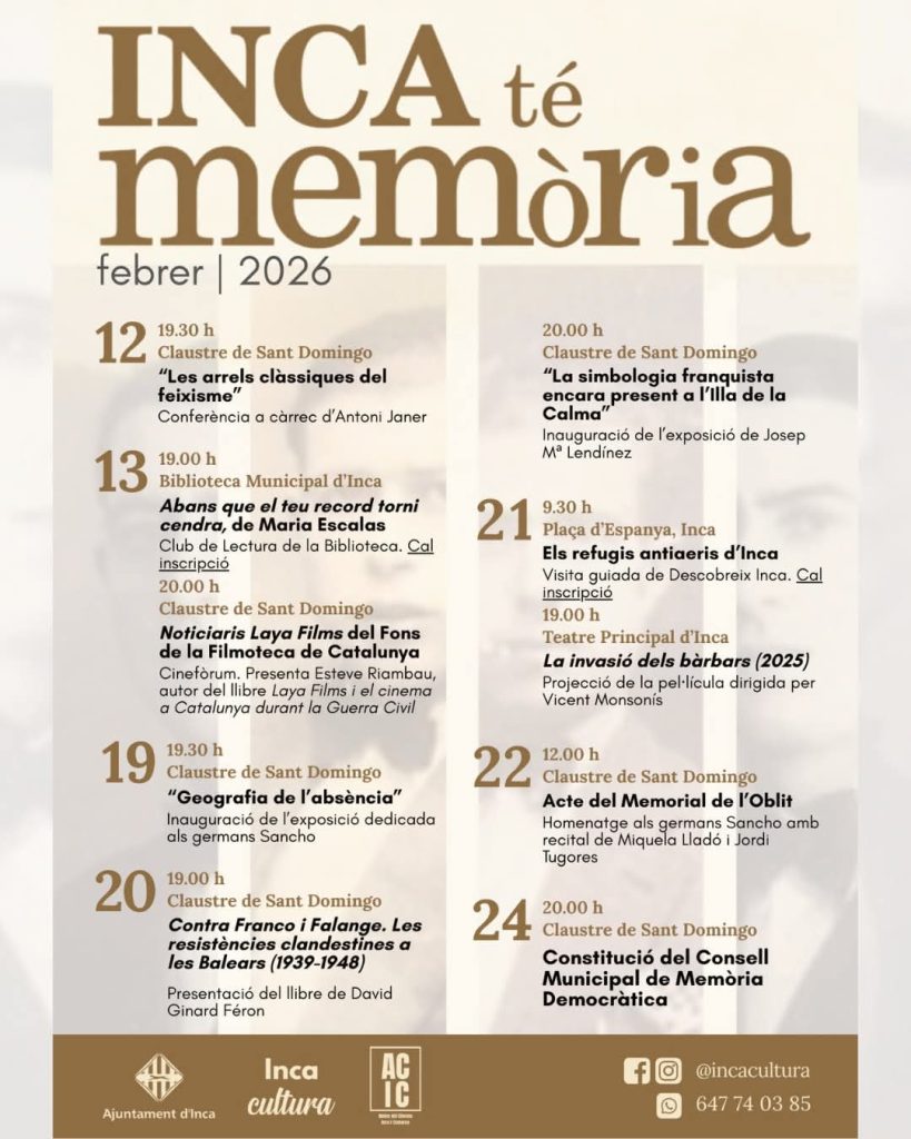 «Inca té memòria» s’inaugurarà el 12 de febrer amb la conferència «Les arrels clàssiques del feixisme», a càrrec del periodista i divulgador Antoni Janer. L’endemà, el Claustre de Sant Domingo acollirà la projecció dels noticiaris de Laya Films, procedents del fons de la Filmoteca de Catalunya, amb comentari de l’expert Esteve Riambau.
