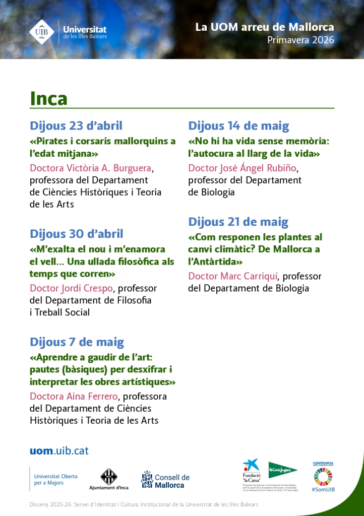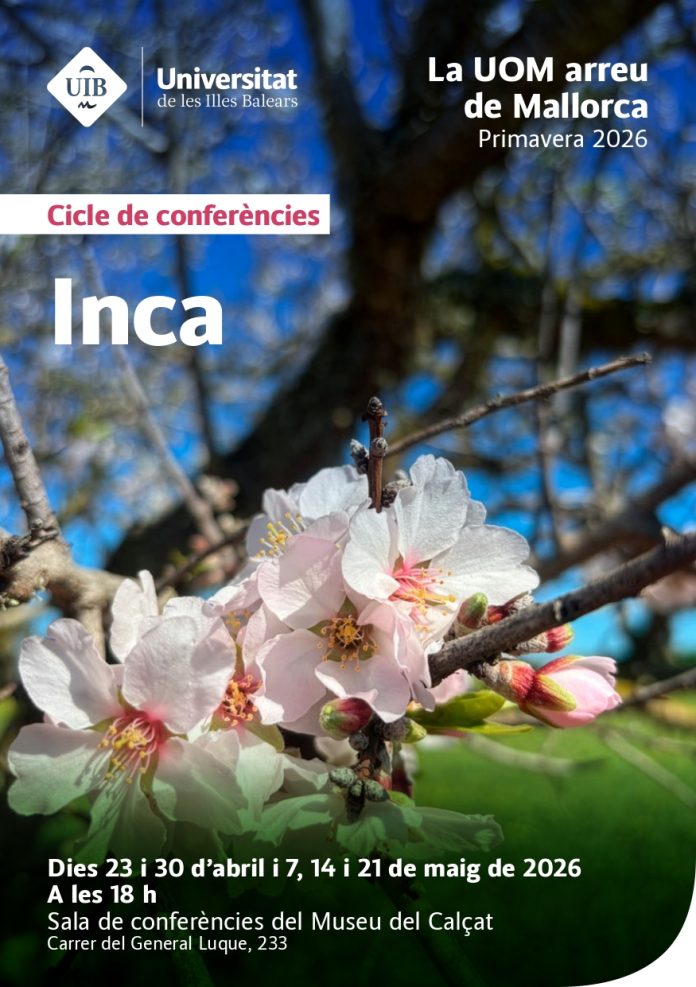 La Universitat de les Illes Balears durà a terme aquesta primavera un nou cicle de conferències a Inca, amb l’objectiu d’acostar el coneixement acadèmic a la ciutadania. La iniciativa, emmarcada dins el programa “La UOM arreu de Mallorca”, oferirà cinc sessions gratuïtes entre el 23 d’abril i el 21 de maig de 2026.